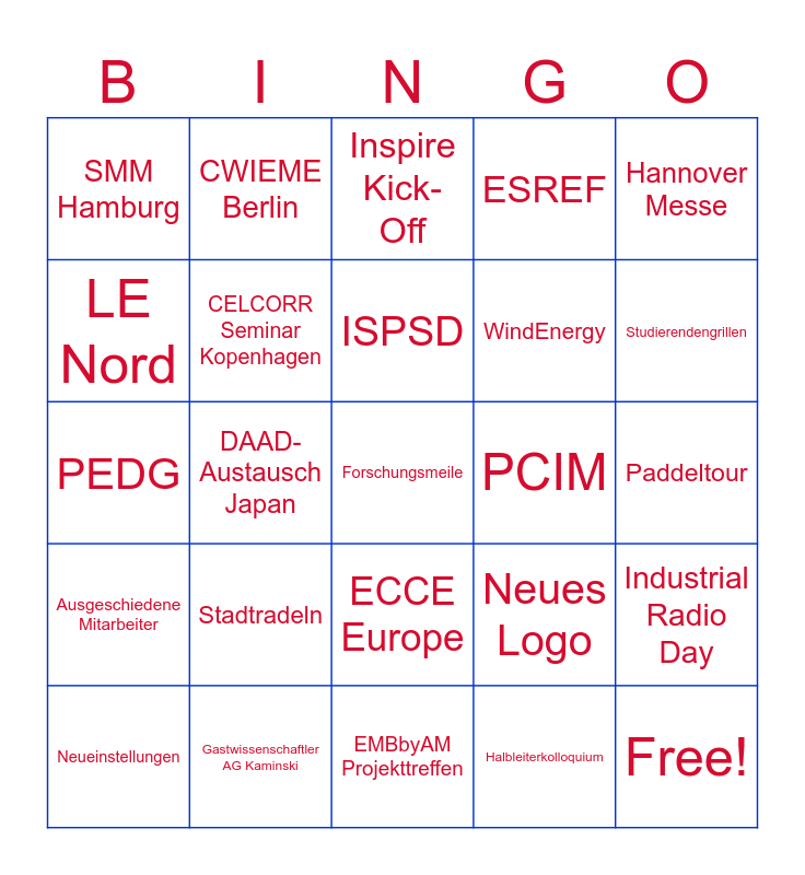 This bingo card has 33 words: Free!, Kohlfahrt, DAAD-Austausch Japan, Gastwissenschaftler AG Ebrahimi, Ausgeschiedene Mitarbeiter, CELCORR Seminar Kopenhagen, Hannover Messe, Neueinstellungen, CWIEME Berlin, Dissertationskolloquium David Matthies, ISPSD, Inspire Kick-Off, Sommerfest / Volleyballtunier, IdeenExpo, PCIM, Studierendengrillen, Gastwissenschaftler AG Kaminski, PEDG, Stadtradeln, Neues Logo, ECCE Europe, ICEM24, SMM Hamburg, Paddeltour, EMBbyAM Projekttreffen, Forschungsmeile, ESREF, WindEnergy, LE Nord, Industrial Radio Day, Neuer Aufenthaltsraum, Halbleiterkolloquium and ISGSTC Workshop.