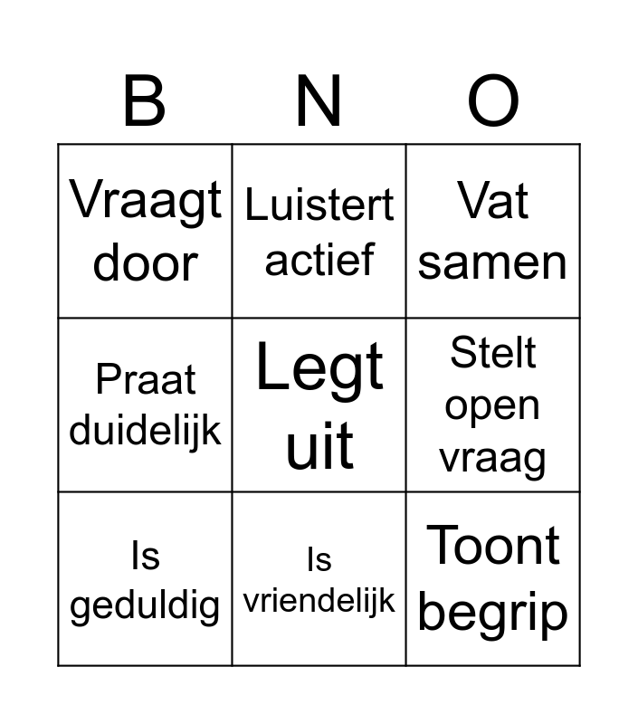 This bingo card has a free space and 8 words: Stelt open vraag, Vat samen, Luistert actief, Is geduldig, Vraagt door, Toont begrip, Praat duidelijk and Is vriendelijk.
