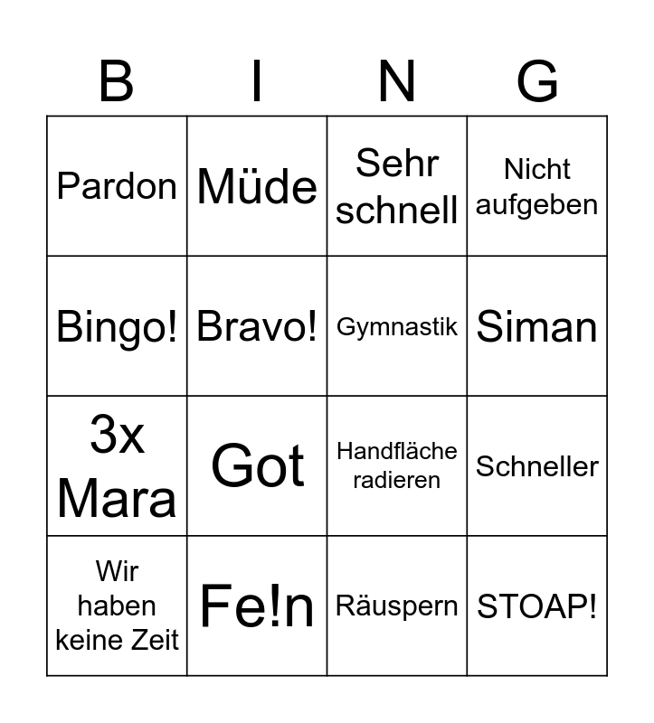 This bingo card has 16 words: Fe!n, Schneller, Sehr schnell, Pardon, 3x Mara, Müde, Handfläche radieren, Räuspern, Bingo!, Bravo!, Wir haben keine Zeit, Nicht aufgeben, Got, Siman, Gymnastik and STOAP!.