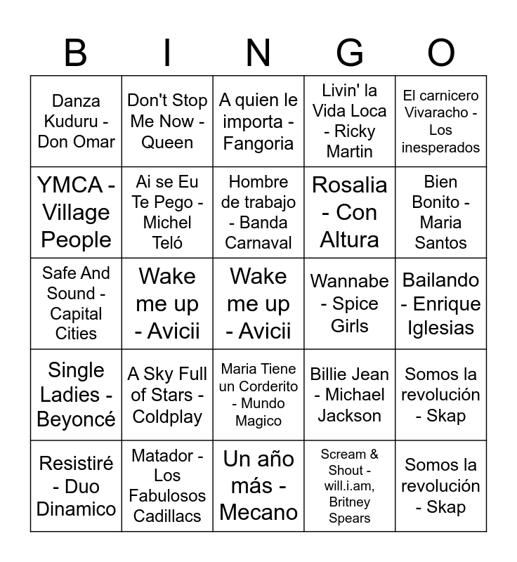 ⚠ This card has duplicate items: La mujer del pelotero - Baby Flores (2), Sra. Vaca y Sr. Toro - Luna creciente (2), Wake me up - Avicii (2), A fuego lento - Rosana (2), Mi rumba tarumba - Seguridad Social (2), Un año más - Mecano (2), Pastillas de Freno - Estopa (2), Tractor Amarillo - Zapato Veloz (2), Ai se Eu Te Pego - Michel Teló (2), Waka Waka - Shakira (2), Hombre de trabajo - Banda Carnaval (2), Sin Documentos - Los Rodriguez (2), Wannabe - Spice Girls (2), La carnicera - Agustin Bedoya (2), Bien Bonito - Maria Santos (2), Single Ladies - Beyoncé (2), Don't Stop Me Now - Queen (2), Felicidad - La Cabra Mecanica (2), La luna y el Toro - El Fary (2), Starships - Nicki Minaj (2), A Sky Full of Stars - Coldplay (2), La Vaca Lola - La Granja de Zenón (2), Danza Kuduru - Don Omar (2), Crazy - Gnarls Barkley (2), Despacito - Luis Fonsi, Daddy Yankee (2), El carnicero Vivaracho - Los inesperados (2), YMCA - Village People (2), Livin' la Vida Loca - Ricky Martin (2), Let's Get Loud - Jennifer Lopez (2), Despechá - Rosalía (2), Somos la revolución - Skap (2), Matador - Los Fabulosos Cadillacs (2), Billie Jean - Michael Jackson (2)