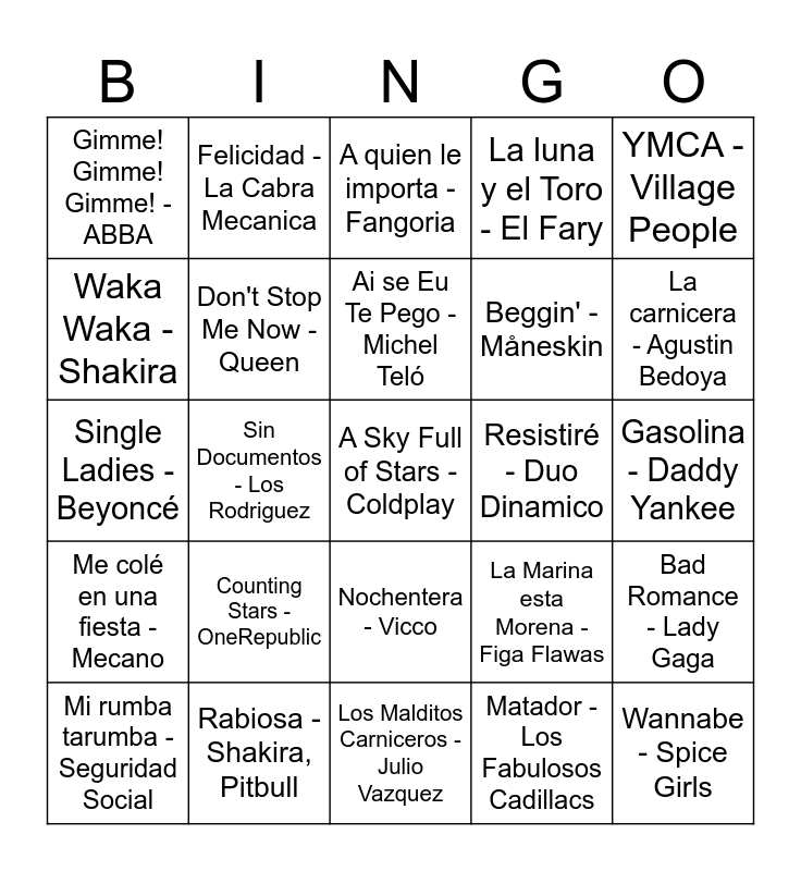 This bingo card has 74 words: El Toro Guapo - El Fary, Los lunes que Quedan - No te fallaré, A quien le importa - Fangoria, Gangnam Style - PSY, La mujer del pelotero - Baby Flores, Sra. Vaca y Sr. Toro - Luna creciente, Wake me up - Avicii, A fuego lento - Rosana, Mi rumba tarumba - Seguridad Social, Un año más - Mecano, Pastillas de Freno - Estopa, Tractor Amarillo - Zapato Veloz, Ai se Eu Te Pego - Michel Teló, Waka Waka - Shakira, Hombre de trabajo - Banda Carnaval, Sin Documentos - Los Rodriguez, Wannabe - Spice Girls, La carnicera - Agustin Bedoya, Bien Bonito - Maria Santos, Single Ladies - Beyoncé, Don't Stop Me Now - Queen, Felicidad - La Cabra Mecanica, La luna y el Toro - El Fary, Starships - Nicki Minaj, A Sky Full of Stars - Coldplay, La Vaca Lola - La Granja de Zenón, Danza Kuduru - Don Omar, Crazy - Gnarls Barkley, Despacito - Luis Fonsi, Daddy Yankee, El carnicero Vivaracho - Los inesperados, YMCA - Village People, Livin' la Vida Loca - Ricky Martin, Let's Get Loud - Jennifer Lopez, Despechá - Rosalía, Somos la revolución - Skap, Matador - Los Fabulosos Cadillacs, Billie Jean - Michael Jackson, Maria Tiene un Corderito - Mundo Magico, Safe And Sound - Capital Cities, Scream & Shout - will.i.am, Britney Spears, Los Malditos Carniceros - Julio Vazquez, Rabiosa - Shakira, Pitbull, Get Busy - Sean Paul, El burrito Sabanero - David Bisbal, Macarena - River Re-Mix - Los Del Rio, Gimme! Gimme! Gimme! - ABBA, De Lobo a Cordero - El Barrio, Counting Stars - OneRepublic, La chica de Ayer - Nacha Pop, Amigos para Siempre - Los Manolos, Don't Start Now - Dua Lipa, Smells Like Teen Spirit - Nirvana, Gasolina - Daddy Yankee, I Follow Rivers - Lykke Li, The Magician, Vivir mi vida - Mark Antony, Ay Mamá - Rigoberta Bandinni, Nochentera - Vicco, La Fiesta - Pedro Capó, Rosalia - Con Altura, Bad Romance - Lady Gaga, Beggin' - Måneskin, Lunes - Estopa, Me colé en una fiesta - Mecano, Sarandonga - Lolita, Resistiré - Duo Dinamico, Timber - Pitbull, Kesha, Navidad Flamenca - María Peláe, Color esperanza - Diego Torres, La Marina esta Morena - Figa Flawas, A mi manera - Siempre Así, Bailoteo - The Tyets, El baile del Gorila - Melody, Bailando - Enrique Iglesias and Cuando Zarpa el Amor - Camela.