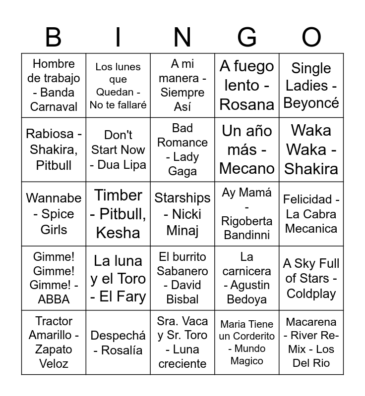 This bingo card has 71 words: El Toro Guapo - El Fary, Los lunes que Quedan - No te fallaré, Gangnam Style - PSY, La mujer del pelotero - Baby Flores, Sra. Vaca y Sr. Toro - Luna creciente, Wake me up - Avicii, A fuego lento - Rosana, Mi rumba tarumba - Seguridad Social, Un año más - Mecano, Pastillas de Freno - Estopa, Tractor Amarillo - Zapato Veloz, Ai se Eu Te Pego - Michel Teló, Waka Waka - Shakira, Hombre de trabajo - Banda Carnaval, Sin Documentos - Los Rodriguez, Wannabe - Spice Girls, La carnicera - Agustin Bedoya, Single Ladies - Beyoncé, Don't Stop Me Now - Queen, Felicidad - La Cabra Mecanica, La luna y el Toro - El Fary, Starships - Nicki Minaj, A Sky Full of Stars - Coldplay, La Vaca Lola - La Granja de Zenón, Danza Kuduru - Don Omar, Crazy - Gnarls Barkley, Despacito - Luis Fonsi, Daddy Yankee, El carnicero Vivaracho - Los inesperados, YMCA - Village People, Let's Get Loud - Jennifer Lopez, Despechá - Rosalía, Somos la revolución - Skap, Matador - Los Fabulosos Cadillacs, Billie Jean - Michael Jackson, Maria Tiene un Corderito - Mundo Magico, Safe And Sound - Capital Cities, Scream & Shout - will.i.am, Britney Spears, Los Malditos Carniceros - Julio Vazquez, Rabiosa - Shakira, Pitbull, Get Busy - Sean Paul, El burrito Sabanero - David Bisbal, Macarena - River Re-Mix - Los Del Rio, Gimme! Gimme! Gimme! - ABBA, De Lobo a Cordero - El Barrio, Counting Stars - OneRepublic, La chica de Ayer - Nacha Pop, Amigos para Siempre - Los Manolos, Don't Start Now - Dua Lipa, Smells Like Teen Spirit - Nirvana, Gasolina - Daddy Yankee, I Follow Rivers - Lykke Li, The Magician, Vivir mi vida - Mark Antony, Ay Mamá - Rigoberta Bandinni, Nochentera - Vicco, La Fiesta - Pedro Capó, Rosalia - Con Altura, Bad Romance - Lady Gaga, Beggin' - Måneskin, Lunes - Estopa, Me colé en una fiesta - Mecano, Sarandonga - Lolita, Resistiré - Duo Dinamico, Timber - Pitbull, Kesha, Navidad Flamenca - María Peláe, Color esperanza - Diego Torres, La Marina esta Morena - Figa Flawas, A mi manera - Siempre Así, Bailoteo - The Tyets, El baile del Gorila - Melody, Bailando - Enrique Iglesias and Cuando Zarpa el Amor - Camela.