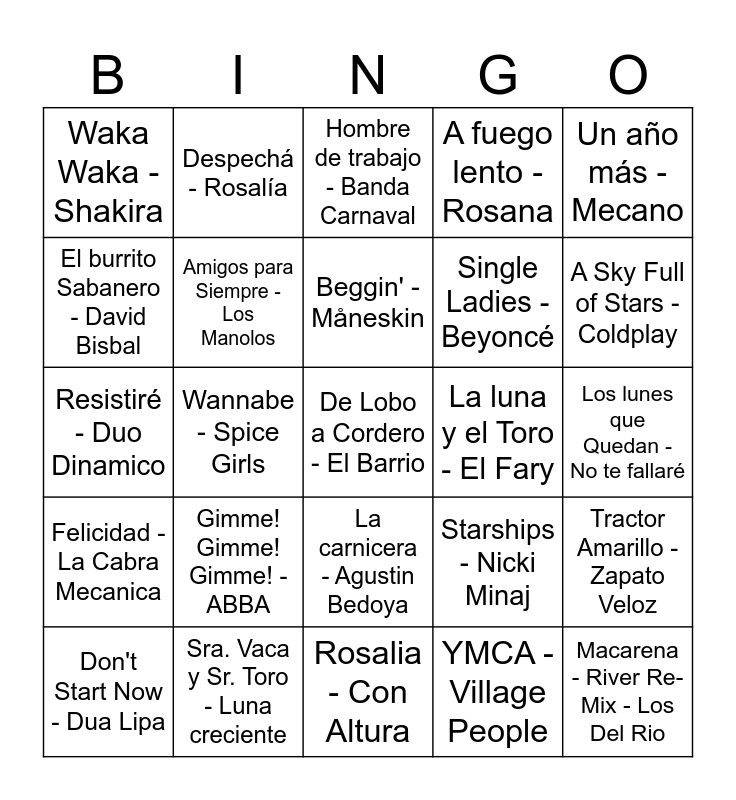 This bingo card has 70 words: El Toro Guapo - El Fary, Los lunes que Quedan - No te fallaré, Gangnam Style - PSY, La mujer del pelotero - Baby Flores, Sra. Vaca y Sr. Toro - Luna creciente, Wake me up - Avicii, A fuego lento - Rosana, Mi rumba tarumba - Seguridad Social, Un año más - Mecano, Pastillas de Freno - Estopa, Tractor Amarillo - Zapato Veloz, Ai se Eu Te Pego - Michel Teló, Waka Waka - Shakira, Hombre de trabajo - Banda Carnaval, Sin Documentos - Los Rodriguez, Wannabe - Spice Girls, La carnicera - Agustin Bedoya, Single Ladies - Beyoncé, Don't Stop Me Now - Queen, Felicidad - La Cabra Mecanica, La luna y el Toro - El Fary, Starships - Nicki Minaj, A Sky Full of Stars - Coldplay, La Vaca Lola - La Granja de Zenón, Danza Kuduru - Don Omar, Crazy - Gnarls Barkley, Despacito - Luis Fonsi, Daddy Yankee, El carnicero Vivaracho - Los inesperados, YMCA - Village People, Let's Get Loud - Jennifer Lopez, Despechá - Rosalía, Somos la revolución - Skap, Billie Jean - Michael Jackson, Maria Tiene un Corderito - Mundo Magico, Safe And Sound - Capital Cities, Scream & Shout - will.i.am, Britney Spears, Los Malditos Carniceros - Julio Vazquez, Rabiosa - Shakira, Pitbull, Get Busy - Sean Paul, El burrito Sabanero - David Bisbal, Macarena - River Re-Mix - Los Del Rio, Gimme! Gimme! Gimme! - ABBA, De Lobo a Cordero - El Barrio, Counting Stars - OneRepublic, La chica de Ayer - Nacha Pop, Amigos para Siempre - Los Manolos, Don't Start Now - Dua Lipa, Smells Like Teen Spirit - Nirvana, Gasolina - Daddy Yankee, I Follow Rivers - Lykke Li, The Magician, Vivir mi vida - Mark Antony, Ay Mamá - Rigoberta Bandinni, Nochentera - Vicco, La Fiesta - Pedro Capó, Rosalia - Con Altura, Bad Romance - Lady Gaga, Beggin' - Måneskin, Lunes - Estopa, Me colé en una fiesta - Mecano, Sarandonga - Lolita, Resistiré - Duo Dinamico, Timber - Pitbull, Kesha, Navidad Flamenca - María Peláe, Color esperanza - Diego Torres, La Marina esta Morena - Figa Flawas, A mi manera - Siempre Así, Bailoteo - The Tyets, El baile del Gorila - Melody, Bailando - Enrique Iglesias and Cuando Zarpa el Amor - Camela.