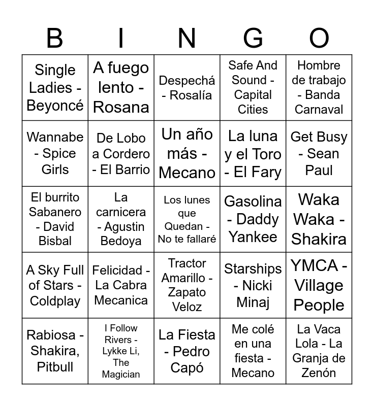 This bingo card has 68 words: El Toro Guapo - El Fary, Los lunes que Quedan - No te fallaré, Gangnam Style - PSY, La mujer del pelotero - Baby Flores, Sra. Vaca y Sr. Toro - Luna creciente, Wake me up - Avicii, A fuego lento - Rosana, Mi rumba tarumba - Seguridad Social, Un año más - Mecano, Pastillas de Freno - Estopa, Tractor Amarillo - Zapato Veloz, Ai se Eu Te Pego - Michel Teló, Waka Waka - Shakira, Hombre de trabajo - Banda Carnaval, Sin Documentos - Los Rodriguez, Wannabe - Spice Girls, La carnicera - Agustin Bedoya, Single Ladies - Beyoncé, Don't Stop Me Now - Queen, Felicidad - La Cabra Mecanica, La luna y el Toro - El Fary, Starships - Nicki Minaj, A Sky Full of Stars - Coldplay, La Vaca Lola - La Granja de Zenón, Danza Kuduru - Don Omar, Crazy - Gnarls Barkley, Despacito - Luis Fonsi, Daddy Yankee, El carnicero Vivaracho - Los inesperados, YMCA - Village People, Let's Get Loud - Jennifer Lopez, Despechá - Rosalía, Somos la revolución - Skap, Billie Jean - Michael Jackson, Maria Tiene un Corderito - Mundo Magico, Safe And Sound - Capital Cities, Scream & Shout - will.i.am, Britney Spears, Los Malditos Carniceros - Julio Vazquez, Rabiosa - Shakira, Pitbull, Get Busy - Sean Paul, El burrito Sabanero - David Bisbal, Macarena - River Re-Mix - Los Del Rio, Gimme! Gimme! Gimme! - ABBA, De Lobo a Cordero - El Barrio, Counting Stars - OneRepublic, La chica de Ayer - Nacha Pop, Amigos para Siempre - Los Manolos, Don't Start Now - Dua Lipa, Smells Like Teen Spirit - Nirvana, Gasolina - Daddy Yankee, I Follow Rivers - Lykke Li, The Magician, Vivir mi vida - Mark Antony, Ay Mamá - Rigoberta Bandinni, Nochentera - Vicco, La Fiesta - Pedro Capó, Bad Romance - Lady Gaga, Beggin' - Måneskin, Me colé en una fiesta - Mecano, Sarandonga - Lolita, Resistiré - Duo Dinamico, Timber - Pitbull, Kesha, Navidad Flamenca - María Peláe, Color esperanza - Diego Torres, La Marina esta Morena - Figa Flawas, A mi manera - Siempre Así, Bailoteo - The Tyets, El baile del Gorila - Melody, Bailando - Enrique Iglesias and Cuando Zarpa el Amor - Camela.