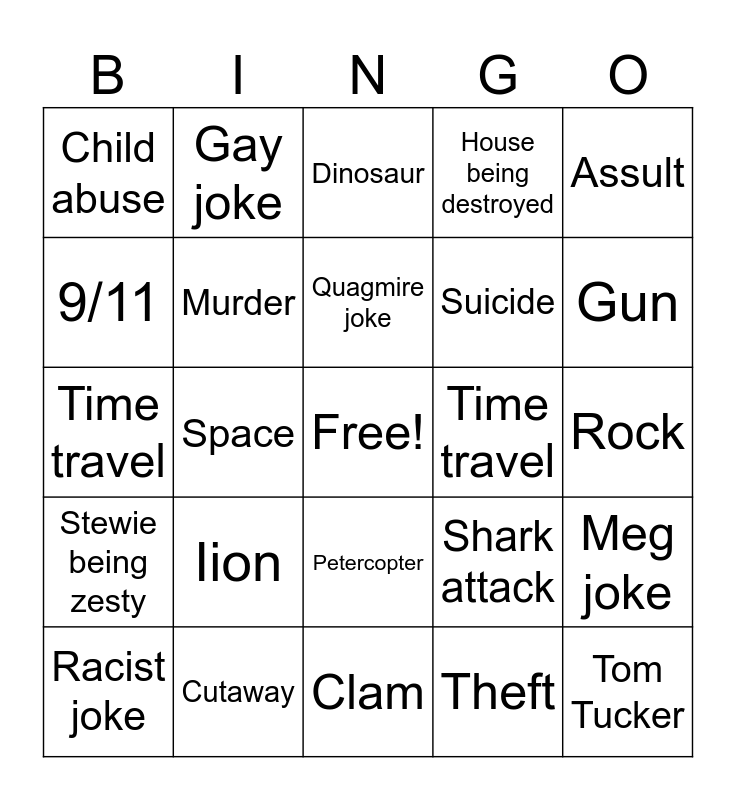 This bingo card has a free space and 24 words: Iion, Cutaway, Quagmire joke, Racist joke, Assult, Child abuse, 9/11, Gay joke, Time travel, Petercopter, Suicide, Time travel, Shark attack, Meg joke, Murder, Theft, Rock, Dinosaur, Gun, Space, Tom Tucker, Stewie being zesty, House being destroyed and Clam.