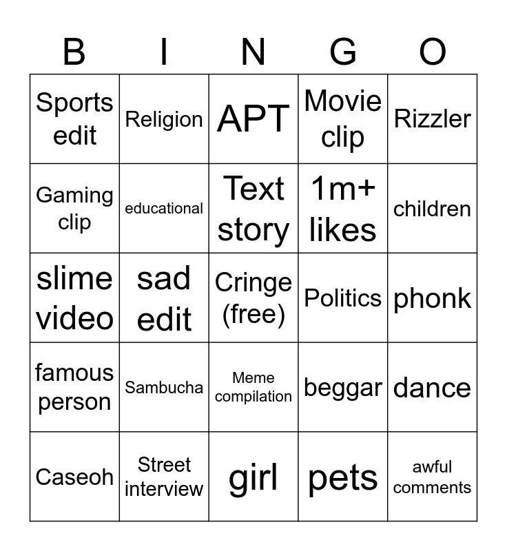 This bingo card has a free space and 24 words: Sambucha, Street interview, Text story, Caseoh, Rizzler, Sports edit, Gaming clip, Religion, Politics, Meme compilation, 1m+ likes, slime video, beggar, dance, educational, pets, phonk, APT, children, sad edit, awful comments, famous person, Movie clip and girl.
