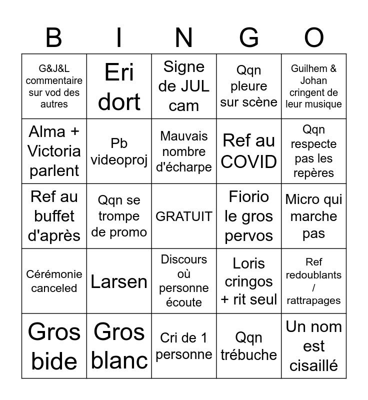 This bingo card has a free space and 24 words: Larsen, Gros blanc, Mauvais nombre d'écharpe, Gros bide, Guilhem & Johan cringent de leur musique, G&J&L commentaire sur vod des autres, Alma + Victoria parlent, Eri dort, Fiorio le gros pervos, Discours où personne écoute, Ref au COVID, Ref au buffet d'après, Loris cringos + rit seul, Ref redoublants / rattrapages, Pb videoproj, Qqn trébuche, Micro qui marche pas, Signe de JUL cam, Qqn respecte pas les repères, Qqn se trompe de promo, Un nom est cisaillé, Cérémonie canceled, Qqn pleure sur scène and Cri de 1 personne.