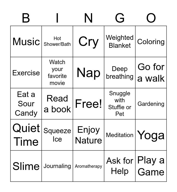 This bingo card has a free space and 24 words: Squeeze Ice, Journaling, Nap, Slime, Coloring, Music, Exercise, Hot Shower/Bath, Snuggle with Stuffie or Pet, Enjoy Nature, Deep breathing, Eat a Sour Candy, Meditation, Yoga, Watch your favorite movie, Ask for Help, Gardening, Cry, Go for a walk, Read a book, Play a Game, Quiet Time, Weighted Blanket and Aromatherapy.