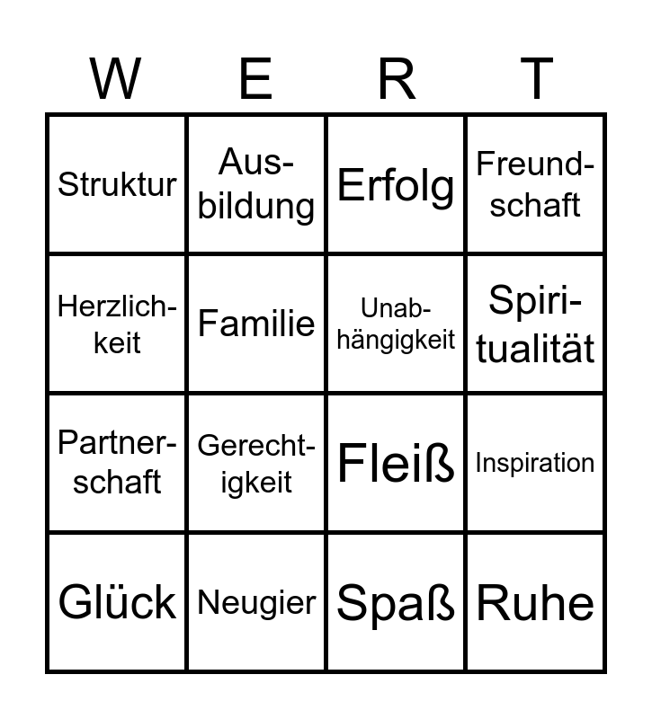 This bingo card has 29 words: Freiheit, Ent-spannung, Inspiration, Sicherheit, Struktur, Erfolg, Unab-hängigkeit, Gesund-heit, Neugier, Freund-lichkeit, Spaß, Glück, Freude, Kreativität, Gerecht-igkeit, Hilfsbe-reitschaft, Pünktlich-keit, Ruhe, Herzlich-keit, Fleiß, Arbeit, Empathie, Partner-schaft, Familie, Freund-schaft, Aus-bildung, Frei-zeit, Spiri-tualität and Engage-ment.