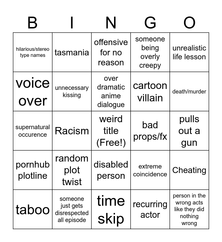 This bingo card has a free space and 24 words: random plot twist, someone just gets disrespected all episode, over dramatic anime dialogue, taboo, unrealistic life lesson, hilarious/stereo type names, voice over, tasmania, bad props/fx, disabled person, cartoon villain, supernatural occurence, extreme coincidence, Cheating, unnecessary kissing, recurring actor, pulls out a gun, offensive for no reason, death/murder, Racism, person in the wrong acts like they did nothing wrong, pornhub plotline, someone being overly creepy and time skip.