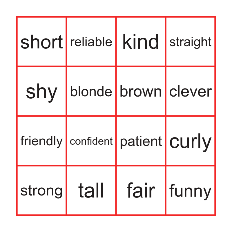 This bingo card has 16 words: tall, curly, kind, short, friendly, reliable, patient, fair, shy, blonde, strong, straight, confident, clever, brown and funny.