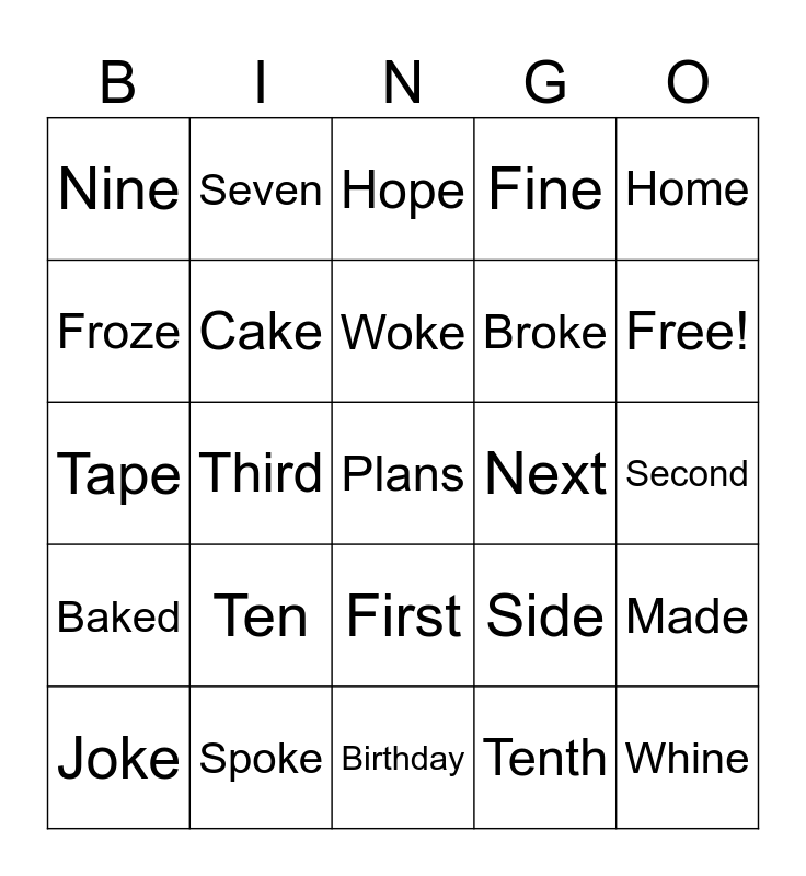 This bingo card has 42 words: Rose, Woke, Date, Ten, Tenth, Made, Plans, Take, Hope, First, Second, Free!, Third, Home, Gate, Side, Note, Tape, Code, Seven, Froze, Choke, Whine, Nine, Wine, White, Broke, Out, White, Cute, Kite, Baked, Cake, Birthday, Name, Joke, Spoke, Next, June, July, Fine and Time.