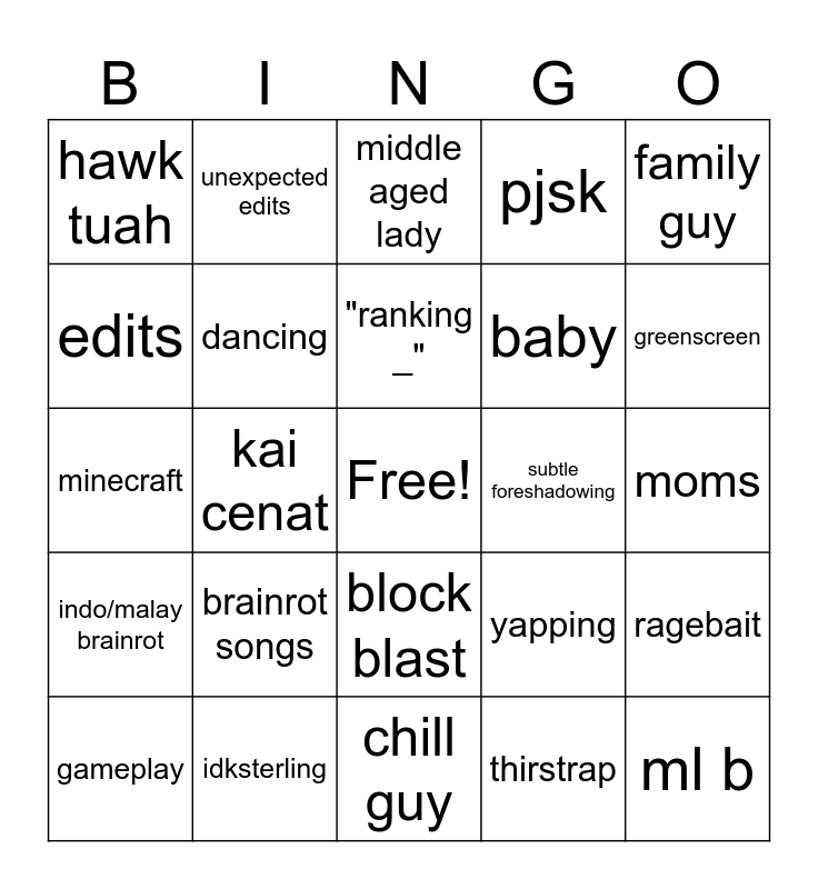 This bingo card has a free space and 24 words: brainrot songs, idksterling, "ranking _", gameplay, family guy, hawk tuah, edits, unexpected edits, subtle foreshadowing, block blast, baby, minecraft, yapping, ragebait, dancing, thirstrap, moms, middle aged lady, greenscreen, kai cenat, ml b, indo/malay brainrot, pjsk and chill guy.