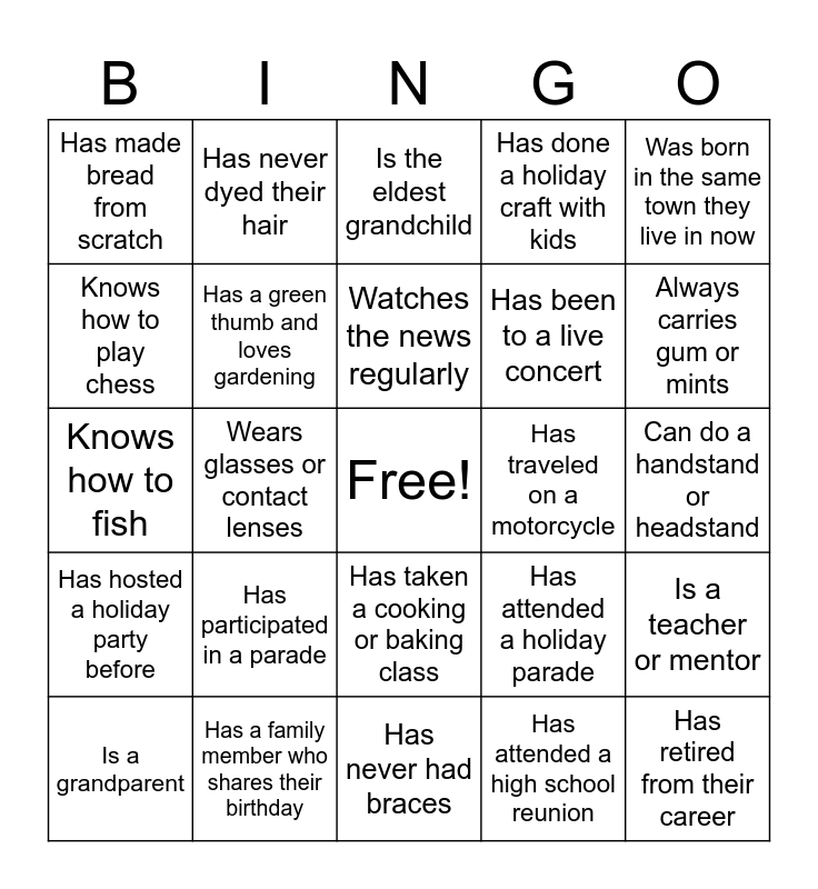 This bingo card has a free space and 24 words: Has participated in a parade, Has a family member who shares their birthday, Watches the news regularly, Is a grandparent, Was born in the same town they live in now, Has made bread from scratch, Knows how to play chess, Has never dyed their hair, Has traveled on a motorcycle, Has taken a cooking or baking class, Has been to a live concert, Knows how to fish, Has attended a holiday parade, Is a teacher or mentor, Has a green thumb and loves gardening, Has attended a high school reunion, Can do a handstand or headstand, Is the eldest grandchild, Always carries gum or mints, Wears glasses or contact lenses, Has retired from their career, Has hosted a holiday party before, Has done a holiday craft with kids and Has never had braces.