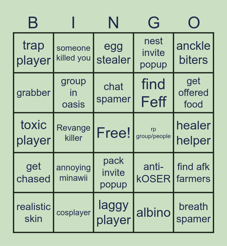 This bingo card has a free space and 29 words: KOSERS, cosplayer, egg stealer, argument in chat, anckle biters, trap player, group in oasis, chat spamer, rp group/people, find afk farmers, realistic skin, Revange killer, albino, breath spamer, toxic player, combat logger, laggy player, anti- kOSER, get offered food, get chased, annoying minawii, pack group invite, find Feff, healer helper, grabber, someone killed you, pack invite popup, nest invite popup and begger.