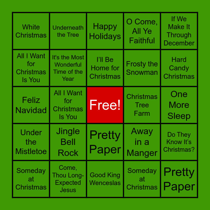 ⚠ This card has duplicate items: O Holy Night (2), Hark! The Herald Angels Sing (2), Joy to the World (2), O Come, All Ye Faithful (2), The First Noel (2), Away in a Manger (2), Deck the Halls (2), God Rest Ye Merry, Gentlemen (2), We Three Kings (2), O Little Town of Bethlehem (2), Angels We Have Heard on High (2), It Came Upon a Midnight Clear (2), What Child Is This? (2), Good King Wenceslas (2), The Coventry Carol (2), Once in Royal David’s City (2), I Heard the Bells on Christmas Day (2), Lo, How a Rose E'er Blooming (2), Come, Thou Long-Expected Jesus (2), Last Christmas (2), Wonderful Christmastime (2), Do They Know It’s Christmas? (2), Feliz Navidad (2), Christmas (Baby Please Come Home) (2), Happy Xmas (War Is Over) (2), All I Want for Christmas Is You (2), Underneath the Tree (2), Christmas Lights (2), I’ll Be Home for Christmas (2), It's Beginning to Look a Lot Like Christmas (2), The Christmas Song (Chestnuts Roasting on an Open Fire) (2), One More Sleep (2), Do You Hear What I Hear? (2), Run Rudolph Run (2), Jingle Bell Rock (2), Rockin' Around the Christmas Tree (2), Hard Candy Christmas (2), Christmas in Dixie (2), Pretty Paper (2), If We Make It Through December (2), Christmas Cookies (2), A Holly Jolly Christmas (2), Rudolph the Red-Nosed Reindeer (2), Old Toy Trains (2), What Christmas Means to Me (2), This Christmas (2), Have Yourself a Merry Little Christmas (2), Merry Christmas Baby (2), Someday at Christmas (2), Please Come Home for Christmas (2), I Saw Mommy Kissing Santa Claus (2), (There's No Place Like) Home for the Holidays (2), Happy Holidays (2), A Charlie Brown Christmas (2), Christmas Tree Farm (2), Under the Mistletoe (2), Christmas Without You (2), O Tannenbaum (2), Santa Baby (2), It's the Most Wonderful Time of the Year (2), Sleigh Ride (2), White Christmas (2), Baby It's Cold Outside (2), Carol of the Bells (2)