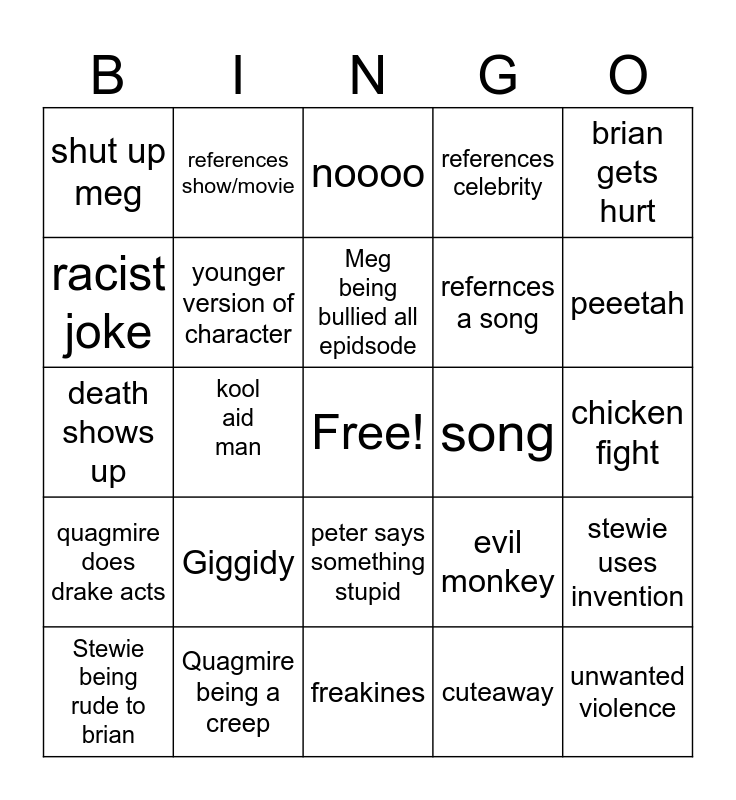 This bingo card has a free space and 24 words: Giggidy, Quagmire being a creep, Meg being bullied all epidsode, Stewie being rude to brian, brian gets hurt, shut up meg, racist joke, references show/movie, song, peter says something stupid, refernces a song, death shows up, evil monkey, stewie uses invention, younger version of character, cuteaway, chicken fight, noooo, peeetah, kool aid man, unwanted violence, quagmire does drake acts, references celebrity and freakines.
