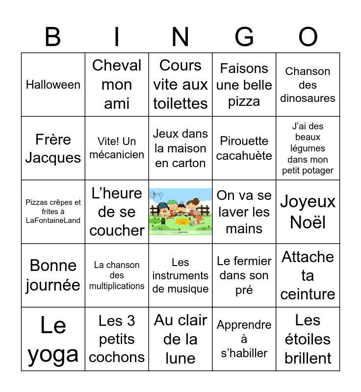 This bingo card has a free space and 27 words: Le fermier dans son pré, Une souris verte, Pirouette cacahuète, Au clair de la lune, Frère Jacques, Cours vite aux toilettes, Cheval mon ami, Bonne journée, On va se laver les mains, Attache ta ceinture, Pizzas crêpes et frites à LaFontaineLand, Faisons une belle pizza, Le yoga, Les 3 petits cochons, J’ai des beaux légumes dans mon petit potager, Attention aux vaches!, Vite! Un mécanicien, Jeux dans la maison en carton, La chanson des multiplications, Halloween, Joyeux Noël, Apprendre à s’habiller, L’heure de se coucher, Les étoiles brillent, Les instruments de musique, Chanson des dinosaures and Je découvre les planètes.