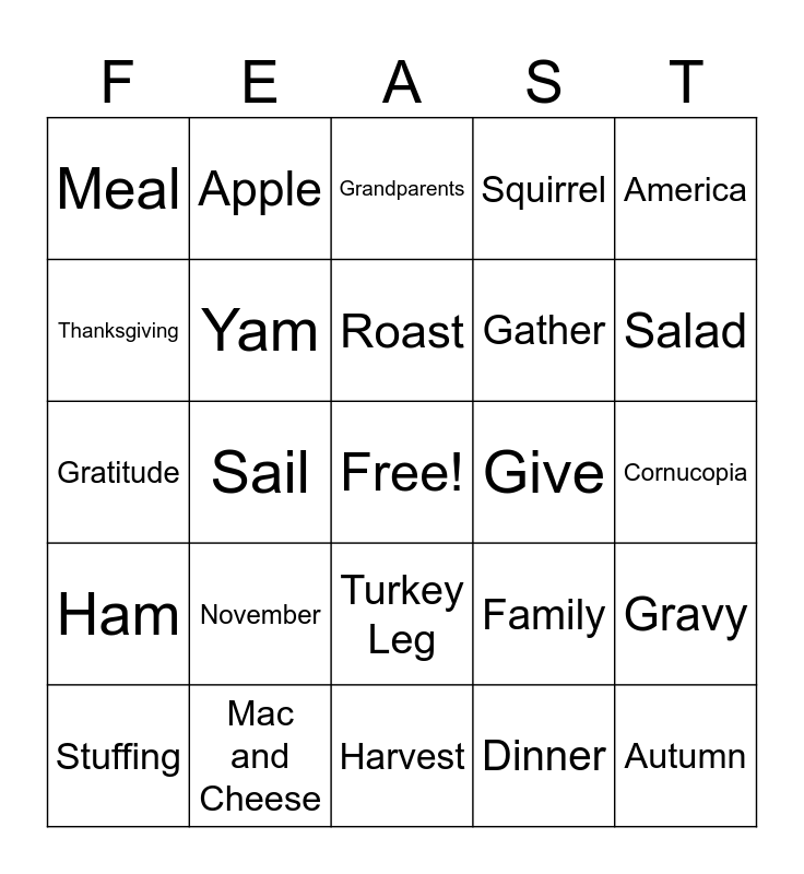 This bingo card has a free space and 54 words: Turkey, Ham, Pilgrim Hat, Pilgrim, Turkey Leg, Gobble! Gobble!, Squirrel, Acorn, Thanksgiving, Feast, Meal, Mayflower, Mac and Cheese, Stuffing, Cranberries, Harvest, Autumn, Gather, Corn, Cornucopia, Family, Friends, Give, America, Bake, Apple, Apple Pie, Cook, Dine, Dinner, Drumstick, Eat, Fall, Football, Grandparents, Parents, Gratitude, Gravy, Holiday, Yam, Leaves, Leftovers, Meat, Native American, November, Pecan, Plymouth Rock, Pie, Roast, Sail, Salad, Sauce, Sweet Potato and Thursday.
