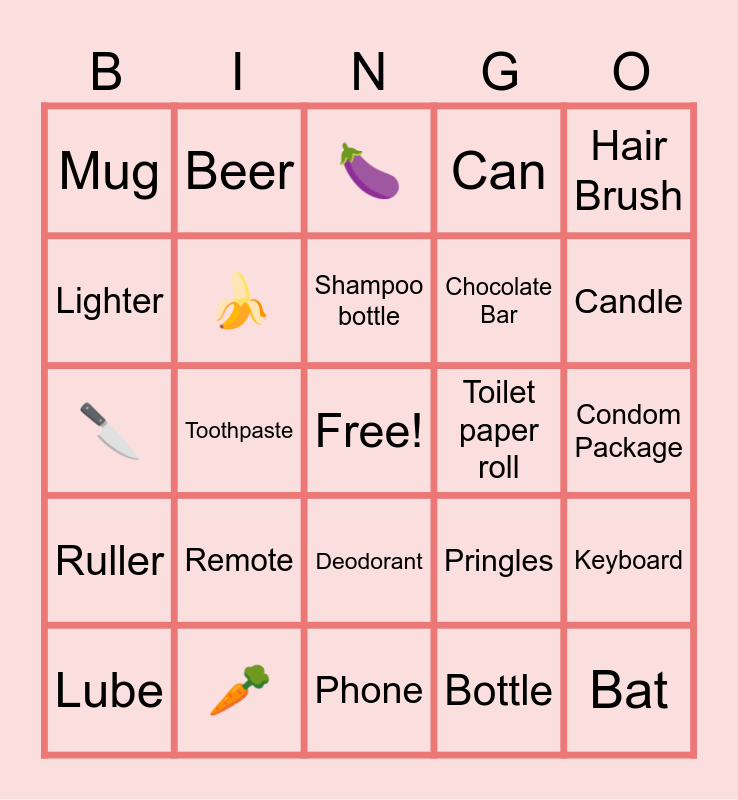 This bingo card has a free space and 24 words: Remote, 🥕, Shampoo bottle, Lube, Hair Brush, Mug, Lighter, Beer, Toilet paper roll, Deodorant, Chocolate Bar, 🔪, Pringles, Keyboard, 🍌, Bottle, Condom Package, 🍆, Candle, Toothpaste, Bat, Ruller, Can and Phone.