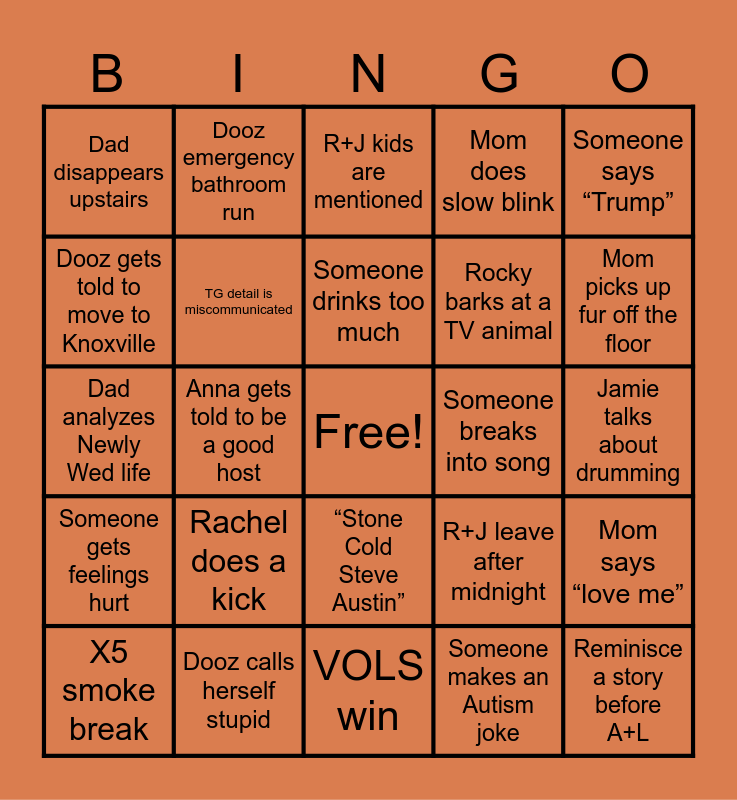 This bingo card has a free space and 24 words: Rachel does a kick, Dooz calls herself stupid, Someone drinks too much, X5 smoke break, Someone says “Trump”, Dad disappears upstairs, Dooz gets told to move to Knoxville, Dooz emergency bathroom run, Someone breaks into song, “Stone Cold Steve Austin”, Rocky barks at a TV animal, Dad analyzes Newly Wed life, R+J leave after midnight, Mom says “love me”, TG detail is miscommunicated, Someone makes an Autism joke, Jamie talks about drumming, R+J kids are mentioned, Mom picks up fur off the floor, Anna gets told to be a good host, Reminisce a story before A+L, Someone gets feelings hurt, Mom does slow blink and VOLS win.