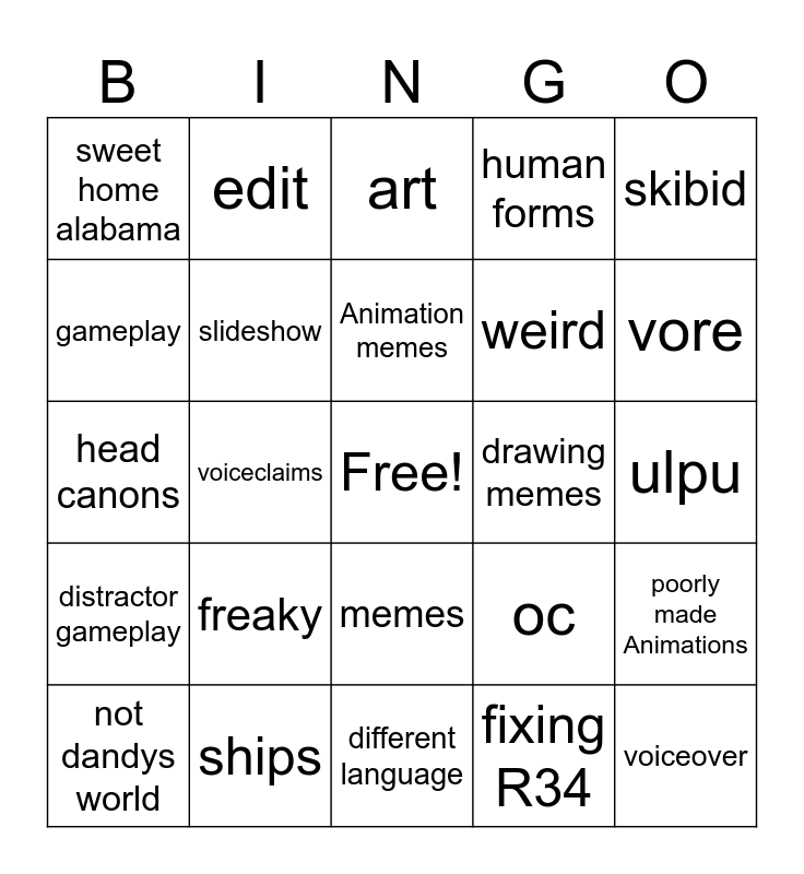 This bingo card has a free space and 24 words: freaky, ships, Animation memes, not dandys world, skibid, sweet home alabama, gameplay, edit, drawing memes, memes, weird, head canons, oc, poorly made Animations, slideshow, fixing R34, ulpu, art, vore, voiceclaims, voiceover, distractor gameplay, human forms and different language.