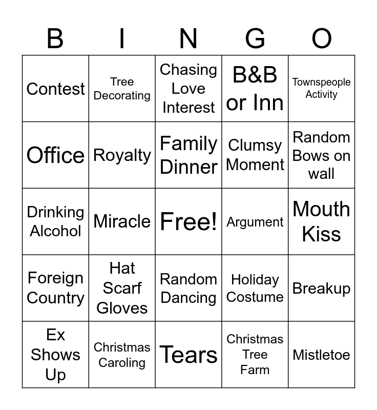 This bingo card has a free space and 24 words: Hat Scarf Gloves, Christmas Caroling, Family Dinner, Ex Shows Up, Townspeople Activity, Contest, Office, Tree Decorating, Argument, Random Dancing, Clumsy Moment, Drinking Alcohol, Holiday Costume, Breakup, Royalty, Christmas Tree Farm, Mouth Kiss, Chasing Love Interest, Random Bows on wall, Miracle, Mistletoe, Foreign Country, B&B or Inn and Tears.
