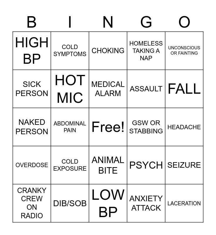 This bingo card has a free space and 24 words: COLD EXPOSURE, DIB/SOB, MEDICAL ALARM, CRANKY CREW ON RADIO, UNCONSCIOUS OR FAINTING, HIGH BP, SICK PERSON, COLD SYMPTOMS, GSW OR STABBING, ANIMAL BITE, ASSAULT, NAKED PERSON, PSYCH, SEIZURE, HOT MIC, ANXIETY ATTACK, HEADACHE, CHOKING, FALL, ABDOMINAL PAIN, LACERATION, OVERDOSE, HOMELESS TAKING A NAP and LOW BP.