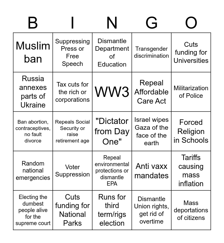 This bingo card has a free space and 24 words: Voter Suppression, Cuts funding for National Parks, WW3, Electing the dumbest people alive for the supreme court, Cuts funding for Universities, Muslim ban, Russia annexes parts of Ukraine, Suppressing Press or Free Speech, Israel wipes Gaza of the face of the earth, Repeal environmental protections or dismantle EPA, Repeal Affordable Care Act, Ban abortion, contraceptives, no fault divorce, Anti vaxx mandates, Tariffs causing mass inflation, Tax cuts for the rich or corporations, Dismantle Union rights, get rid of overtime, Forced Religion in Schools, Dismantle Department of Education, Militarization of Police, Repeals Social Security or raise retirement age, Mass deportations of citizens, Random national emergencies, Transgender discrimination and Runs for third term/rigs election.
