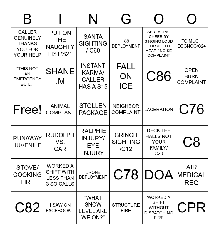 This bingo card has 36 words: C78, DRONE DEPLOYMENT, STRUCTURE FIRE, "THIS NOT AN EMERGENCY BUT...", RUNAWAY JUVENILE, NEIGHBOR COMPLAINT, SHANE .M, "WHAT SNOW LEVEL ARE WE ON?", SPREADING CHEER BY SINGING LOUD FOR ALL TO HEAR / NOISE COMPLAINT, DOA, OPEN BURN COMPLAINT, K-9 DEPLOYMENT, AIR MEDICAL REQ, ANIMAL COMPLANT, FALL ON ICE, CALLER GENUINELY THANKS YOU FOR YOUR HELP, STOVE/ COOKING FIRE, LACERATION, Free!, SANTA SIGHTING / C60, STOLLEN PACKAGE, RUDOLPH VS. CAR, GRINCH SIGHTING /C12, RALPHIE INJURY/ EYE INJURY, DECK THE HALLS NOT YOUR FAMILY/ C20, PUT ON THE NAUGHTY LIST/S21, C86, I SAW ON FACEBOOK..., INSTANT KARMA/ CALLER HAS A S15, TO MUCH EGGNOG/C24, CPR, C82, C8, C76, WORKED A SHIFT WITH LESS THAN 3 SO CALLS and WORKED A SHIFT WITHOUT DISPATCHING FIRE.