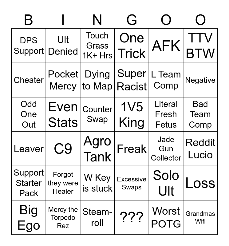 This bingo card has 36 words: Excessive Swaps, W Key is stuck, ???, Cheater, Leaver, 1V5 King, Pocket Mercy, Steam-roll, AFK, Solo Ult, Negative, One Trick, Loss, Even Stats, Super Racist, DPS Support, Support Starter Pack, Literal Fresh Fetus, Odd One Out, Touch Grass 1K+ Hrs, Counter Swap, C9, Freak, Agro Tank, Jade Gun Collector, Ult Denied, L Team Comp, Mercy the Torpedo Rez, Dying to Map, TTV BTW, Grandmas Wifi, Big Ego, Reddit Lucio, Bad Team Comp, Forgot they were Healer and Worst POTG.