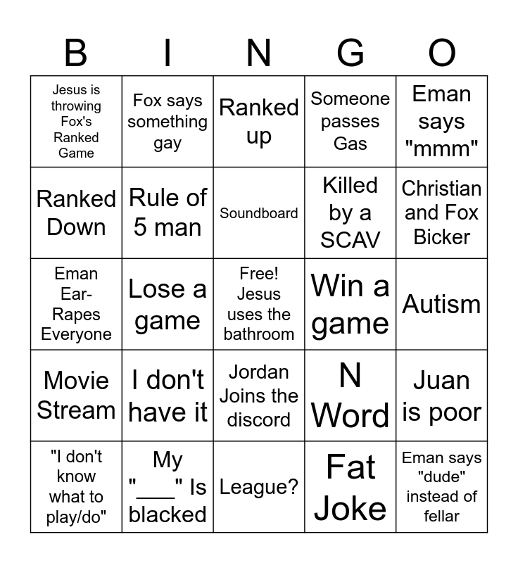 This bingo card has a free space and 24 words: I don't have it, My "___" Is blacked, Soundboard, "I don't know what to play/do", Eman says "mmm", Jesus is throwing Fox's Ranked Game, Ranked Down, Fox says something gay, Win a game, Jordan Joins the discord, Killed by a SCAV, Eman Ear-Rapes Everyone, N Word, Juan is poor, Rule of 5 man, Fat Joke, Autism, Ranked up, Christian and Fox Bicker, Lose a game, Eman says "dude" instead of fellar, Movie Stream, Someone passes Gas and League?.