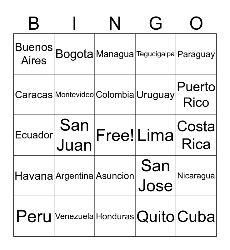 This bingo card has a free space and 24 words: Argentina, Venezuela, Colombia, Peru, Paraguay, Buenos Aires, Caracas, Bogota, Lima, Asuncion, Uruguay, Ecuador, San Jose, Nicaragua, Montevideo, Quito, Costa Rica, Managua, Puerto Rico, San Juan, Cuba, Havana, Tegucigalpa and Honduras.