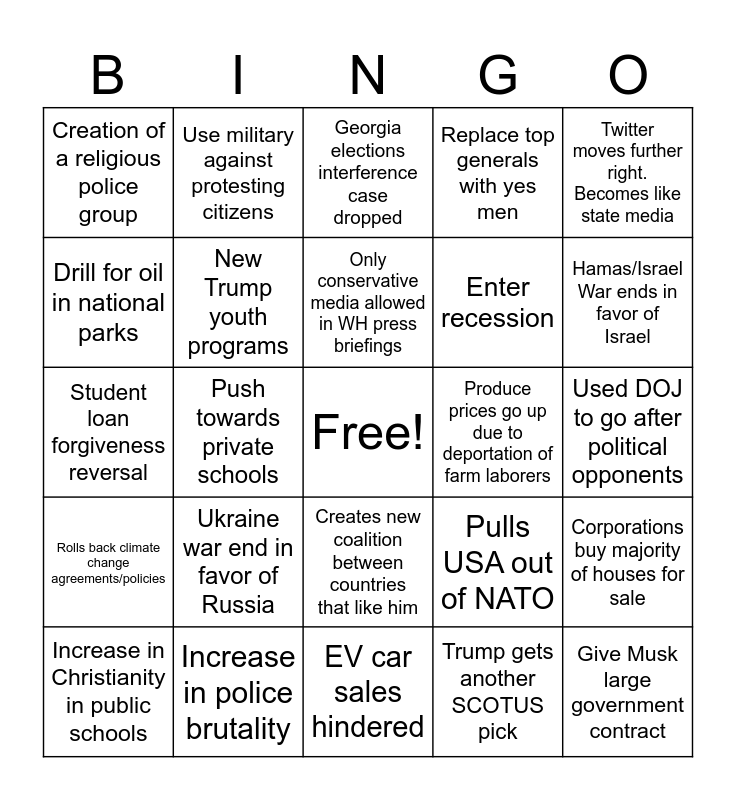This bingo card has a free space and 24 words: Ukraine war end in favor of Russia, Increase in police brutality, Only conservative media allowed in WH press briefings, Increase in Christianity in public schools, Twitter moves further right. Becomes like state media, Creation of a religious police group, Drill for oil in national parks, Use military against protesting citizens, Produce prices go up due to deportation of farm laborers, Creates new coalition between countries that like him, Enter recession, Student loan forgiveness reversal, Pulls USA out of NATO, Corporations buy majority of houses for sale, New Trump youth programs, Trump gets another SCOTUS pick, Used DOJ to go after political opponents, Georgia elections interference case dropped, Hamas/Israel War ends in favor of Israel, Push towards private schools, Give Musk large government contract, Rolls back climate change agreements/policies, Replace top generals with yes men and EV car sales hindered.