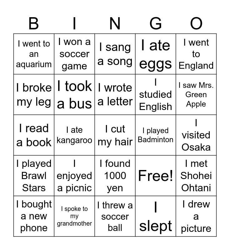 This bingo card has 25 words: I enjoyed a picnic, I threw a soccer ball, I wrote a letter, I bought a new phone, I went to England, I went to an aquarium, I broke my leg, I won a soccer game, I played Badminton, I found 1000 yen, I studied English, I read a book, Free!, I met Shohei Ohtani, I took a bus, I drew a picture, I visited Osaka, I sang a song, I saw Mrs. Green Apple, I ate kangaroo, I cut my hair, I spoke to my grandmother, I played Brawl Stars, I ate eggs and I slept.