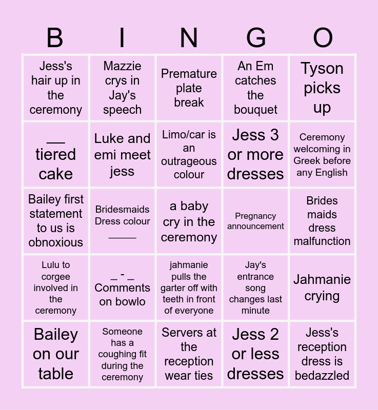 This bingo card has a free space and 28 words: Jahmanie crying, Jay fortnite dance, Jess 3 or more dresses, Jess 2 or less dresses, __ tiered cake, Premature plate break, Mazzie crys in Jay's speech, Lulu to corgee involved in the ceremony, Pregnancy announcement, Bailey on our table, Bailey first statement to us is obnoxious, An Em catches the bouquet, Someone has a coughing fit during the ceremony, Servers at the reception wear ties, Ceremony welcoming in Greek before any English, Traffic jam in break and under estimate free time, _ - _ Comments on bowlo, Luke and emi meet jess, Limo/car is an outrageous colour, jahmanie pulls the garter off with teeth in front of everyone, Jess's hair up in the ceremony, Jess's hair down in the ceremony, Jess's reception dress is bedazzled, Bridesmaids Dress colour _____, Brides maids dress malfunction, Jay's entrance song changes last minute, Tyson picks up and Someone else proposed at anypoint.
