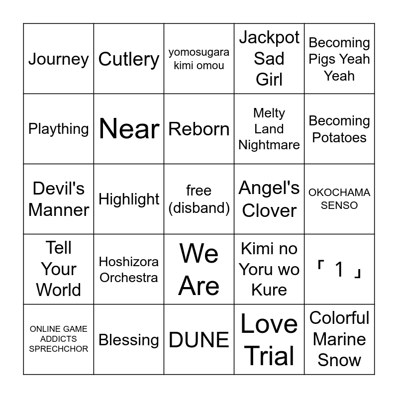 This bingo card has a free space and 24 words: Hoshizora Orchestra, Blessing, Reborn, ONLINE GAME ADDICTS SPRECHCHOR, Becoming Pigs Yeah Yeah, Journey, Plaything, Cutlery, Angel's Clover, We Are, Melty Land Nightmare, Devil's Manner, Kimi no Yoru wo Kure, 「1」, Near, Love Trial, OKOCHAMA SENSO, yomosugara kimi omou, Becoming Potatoes, Highlight, Colorful Marine Snow, Tell Your World, Jackpot Sad Girl and DUNE.