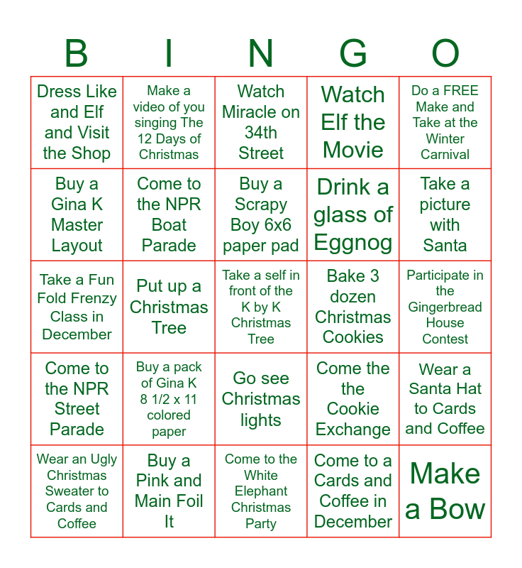 This bingo card has 30 words: Buy a Pink and Main Foil It, Buy a Gina K Ink Pad, Put up a Christmas Tree, Send a Christmas Card to someone special, Dress Like and Elf and Visit the Shop, Watch Miracle on 34th Street, Come to the NPR Boat Parade, Go see Christmas lights, Bake 3 dozen Christmas Cookies, Come to the White Elephant Christmas Party, Participate in the Gingerbread House Contest, Take a self in front of the K by K Christmas Tree, Come to a Cards and Coffee in December, Make a Bow, Take a picture with Santa, Hang a Stocken by the chimney with care, Come the the Cookie Exchange, Come to the NPR Street Parade, Buy a pack of Gina K 8 1/2 x 11 colored paper, Do a FREE Make and Take at the Winter Carnival, Take a Fun Fold Frenzy Class in December, Find the Christmas Pickle, Make a video of you singing The 12 Days of Christmas, Drink a glass of Eggnog, Buy a Gina K Master Layout, Watch Elf the Movie, Wear a Santa Hat to Cards and Coffee, Wear an Ugly Christmas Sweater to Cards and Coffee, Buy a Scrapy Boy 6x6 paper pad and Buy a Creek Bank Creations die.