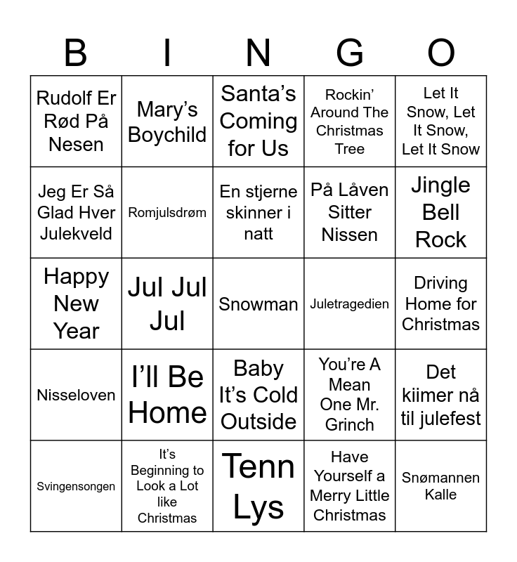 This bingo card has 86 words: All I Want for Christmas Is You, Alt jeg ønsker meg, Baby It’s Cold Outside, Bjelleklang, Blålokk, Candy Cane Lane, Carol of the Bells, Deck The Hall, Deilig Er Den Himmel Blå, Deilig er jorden, Den lure nissen, Desembersang, Det kiimer nå til julefest, Driving Home for Christmas, Du Grønne Glitrende Tre Goddag, En stjerne skinner i natt, Engler i sne, Et barn er født i Betlehem, Everglow, Feliz Navidad, Gje Meg Handa Di Venn, Glade Jul, Happy New Year, Happy Xmas (Was Is Over), Have Yourself a Merry Little Christmas, Hei Hå Nå Er Det Jul Igjen, Here Comes Santa Claus, Himmel På Jord, Holly Jolly Christmas, Home for Christmas, It’s Beginning to Look a Lot like Christmas, It’s Hard to Be a Nissemann, It’s The Most Wonderful Time of the Year, I’ll Be Home, Jeg Er Så Glad Hver Julekveld, Jeg Så Mamma Kysse Nissen, Jingle Bell Rock, Jolevise, Jul i svingen, Jul Jul Jul, Jul, jul, strålande jul, Julekveldsvisa, Julepotpurri, Juletragedien, Last Christmas, Let It Snow, Let It Snow, Let It Snow, Mamsen Og Lillegutt, Mary’s Boychild, Merry Christmas Everyone, Mistletoe, Musevisa, My Only Wish (This Year), Nisseloven, Nå tennes tusen julelys, Når Snøen Smelter, O helga natt, Putti Plutti Pott, På Låven Sitter Nissen, Rockin’ Around The Christmas Tree, Romjulsdrøm, Rudolf Er Rød På Nesen, Santa Claus Is Coming To Town, Santa Lucia, Santa Tell Me, Santa, Can’t You Hear Me, Santa’s Coming for Us, Selmas sang (fra Snøfall), Snowman, Snømannen Kalle, Sonjas Sang Til Julestjernen, Spikke-Sage-Lime-Banke, Stjernesludd, Svingensongen, Så Går Vi Rundt Om En Enebærbusk, Takk for denne dagen, Tenke på en venn, Tenn Lys, The Christmas Song, The Polar Express, Under månen, Vi tenner våre lykter, Vil du være med så heng på, Walking in the Air, White Christmas, You’re A Mean One Mr. Grinch and Å Jul Med Din Glede.