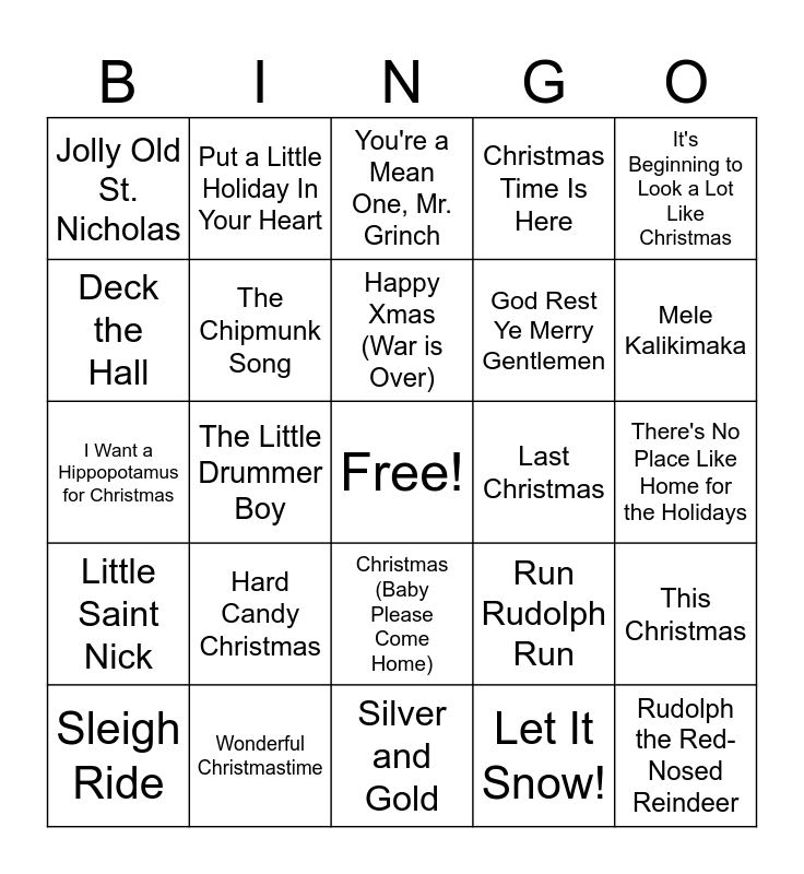 This bingo card has a free space and 35 words: All I Want for Christmas Is You, Baby, It's Cold Outside, Blue Christmas, The Chipmunk Song, Christmas (Baby Please Come Home), Christmas Time Is Here, Deck the Hall, Frosty the Snowman, Happy Xmas (War is Over), A Holly Jolly Christmas, I Want a Hippopotamus for Christmas, It's Beginning to Look a Lot Like Christmas, It's the Most Wonderful Time of Year, Jingle Bell Rock, Jolly Old St. Nicholas, Last Christmas, Let It Snow!, The Little Drummer Boy, Little Saint Nick, Rudolph the Red-Nosed Reindeer, Run Rudolph Run, Sleigh Ride, This Christmas, Wonderful Christmastime, You're a Mean One, Mr. Grinch, Mele Kalikimaka, Please Come Home for Christmas, We Three Kings of Orient Are, God Rest Ye Merry Gentlemen, There's No Place Like Home for the Holidays, What Christmas Means to Me, Silver and Gold, Hard Candy Christmas, Put a Little Holiday In Your Heart and The Christmas Song.