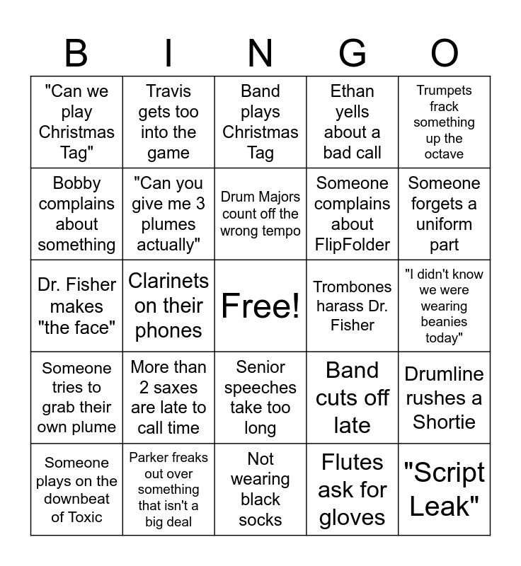 This bingo card has a free space and 24 words: More than 2 saxes are late to call time, Parker freaks out over something that isn't a big deal, Drum Majors count off the wrong tempo, Someone plays on the downbeat of Toxic, Trumpets frack something up the octave, "Can we play Christmas Tag", Bobby complains about something, Travis gets too into the game, Trombones harass Dr. Fisher, Senior speeches take too long, Someone complains about FlipFolder, Dr. Fisher makes "the face", Band cuts off late, Drumline rushes a Shortie, "Can you give me 3 plumes actually", Flutes ask for gloves, "I didn't know we were wearing beanies today", Band plays Christmas Tag, Someone forgets a uniform part, Clarinets on their phones, "Script Leak", Someone tries to grab their own plume, Ethan yells about a bad call and Not wearing black socks.