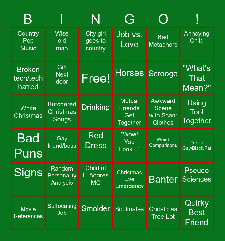 This bingo card has 36 words: Bad Puns, Gay friend/boss, Smolder, Horses, Awkward Scene with Scant Clothes, Using Tool Together, Country Pop Music, Suffocating Job, City girl goes to country, Christmas Eve Emergency, Scrooge, Annoying Child, Signs, Butchered Christmas Songs, Free!, Job vs. Love, Banter, Token Gay/Black/Fat, Broken tech/tech hatred, Girl Next door, Red Dress, "Wow! You Look...", Weird Comparisons, Pseudo Sciences, White Christmas, Wise old man, Drinking, Soulmates, Bad Metaphors, "What's That Mean?", Movie References, Random Personality Analysis, Child of LI Adores MC, Mutual Friends Get Together, Christmas Tree Lot and Quirky Best Friend.