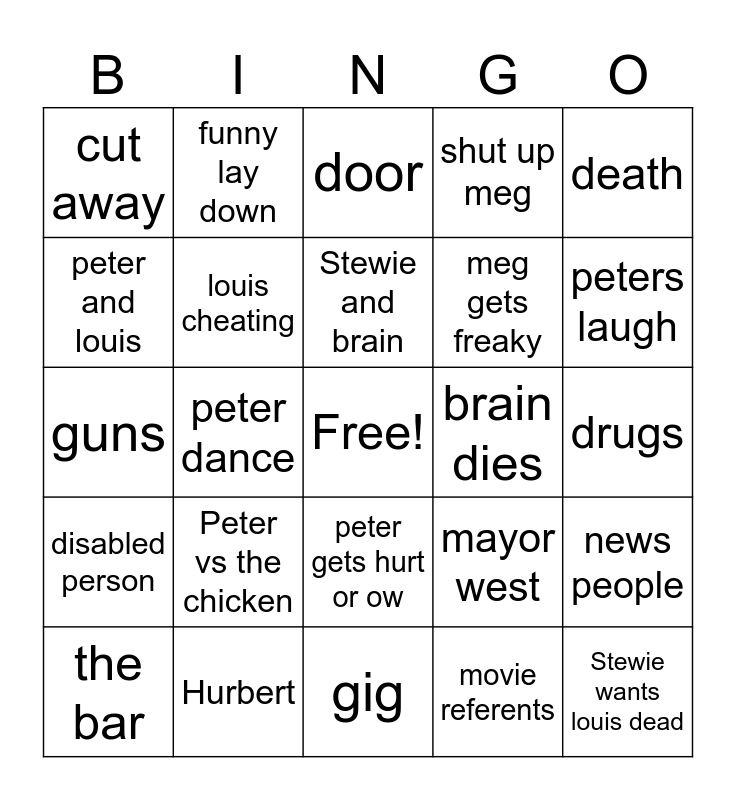 This bingo card has a free space and 24 words: Peter vs the chicken, Hurbert, Stewie and brain, the bar, death, cut away, peter and louis, funny lay down, brain dies, peter gets hurt or ow, meg gets freaky, guns, mayor west, news people, louis cheating, movie referents, drugs, door, peters laugh, peter dance, Stewie wants louis dead, disabled person, shut up meg and gig.