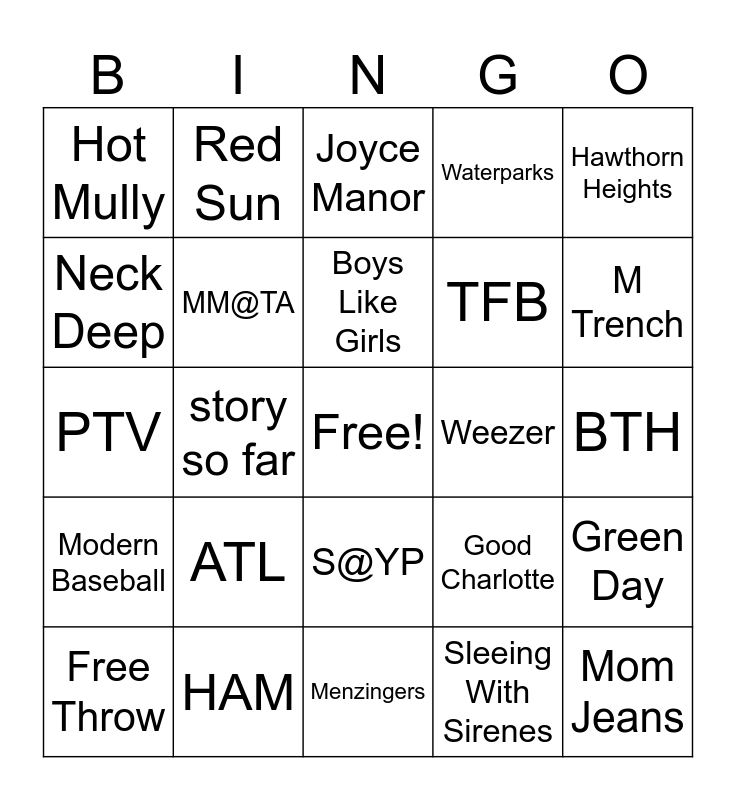 This bingo card has a free space and 24 words: ATL, HAM, Boys Like Girls, Free Throw, Hawthorn Heights, Hot Mully, Neck Deep, Red Sun, Weezer, S@YP, TFB, PTV, Good Charlotte, Green Day, MM@TA, Sleeing With Sirenes, BTH, Joyce Manor, M Trench, story so far, Mom Jeans, Modern Baseball, Waterparks and Menzingers.