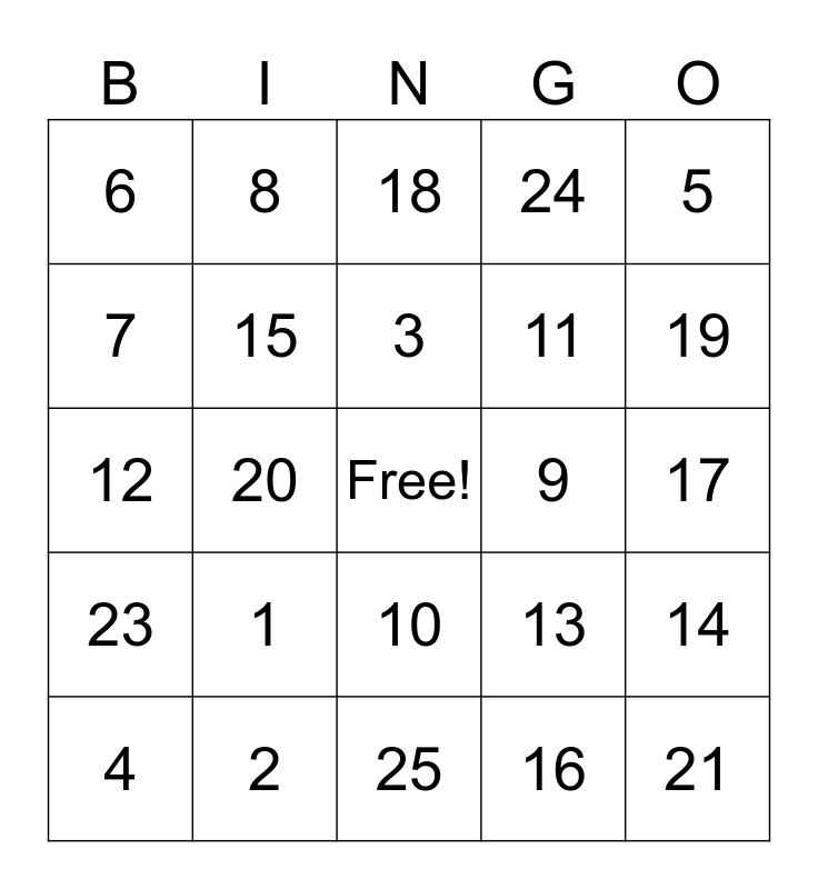 This bingo card has a free space and 24 words: 1, 2, 3, 4, 5, 6, 7, 8, 9, 10, 11, 12, 13, 14, 15, 16, 17, 18, 19, 20, 21, 23, 24 and 25.