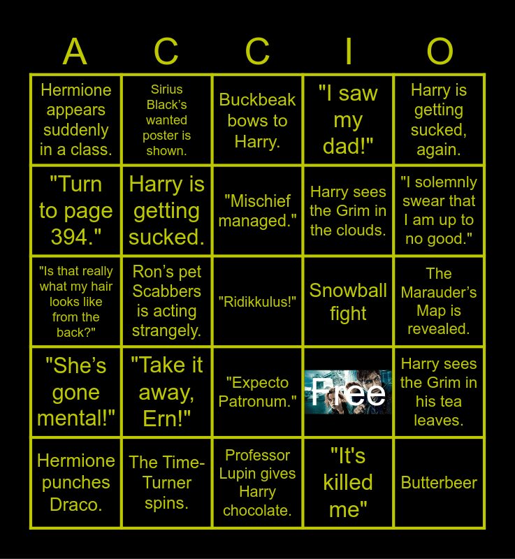 This bingo card has 1 images and 25 words: "Take it away, Ern!", Professor Lupin gives Harry chocolate., "Mischief managed.", Hermione punches Draco., Harry is getting sucked, again., Hermione appears suddenly in a class., "Turn to page 394.", Sirius Black’s wanted poster is shown., Snowball fight, "Expecto Patronum.", Harry sees the Grim in the clouds., "Is that really what my hair looks like from the back?", Free, Harry sees the Grim in his tea leaves., Harry is getting sucked., Butterbeer, The Marauder’s Map is revealed., Buckbeak bows to Harry., "I solemnly swear that I am up to no good.", Ron’s pet Scabbers is acting strangely., "Ridikkulus!", The Time-Turner spins., "She’s gone mental!", "I saw my dad!" and "It's killed me".