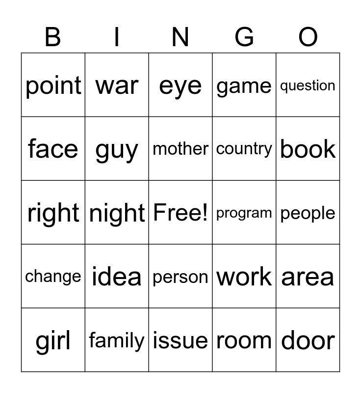 This bingo card has a free space and 100 words: time, year, people, way, day, man, thing, woman, life, child, world, school, state, family, student, group, country, problem, hand, part, place, case, week, company, system, program, question, work, government, number, night, point, home, water, room, mother, area, money, story, fact, month, lot, right, study, book, eye, job, word, business, issue, side, kind, head, house, service, friend, father, power, hour, game, line, end, member, law, car, city, community, name, president, team, minute, idea, kid, body, information, back, parent, face, others, level, office, door, health, person, art, war, history, party, result, change, morning, reason, research, girl, guy, moment, air, teacher, force and education.