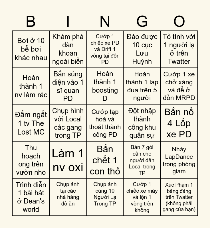 This bingo card has a free space and 24 words: Làm 1 nv oxi, Chụp ảnh tại các nhà hàng đồ ăn, Hoàn thành 1 boosting D, Trình diễn 1 bài hát ở Dean's world, Tỏ tình với 1 người lạ ở trên Twatter, Bơi ở 10 bể bơi khác nhau, Hoàn thành 1 nv làm rác, Khám phá dàn khoan ngoài biển, Đột nhập thành công khu quân sự, Bắn chết 1 con thỏ, Hoàn thành 1 lap đua trên 5 người, Đấm ngất 1 tv The Lost MC, Bán 7 gói cần cho người dân Local trong TP, Nhảy LapDance trong phòng giam, Bắn súng điện vào 1 sĩ quan PD, Cướp 1 chiếc xe máy và lộn 1 vòng trên không, Bắn nổ 4 Lốp xe PD, Cướp 1 chiếc xe PD và Drift 1 vòng tại đồn PD, Cướp 1 xe chở xăng và để ở đồn MRPD, Chụp hình với Local các gang trong TP, Xúc Phạm 1 băng đảng trên Twatter (không phải gang của bạn), Thu hoạch ong trên vườn nho, Đào được 10 cục Lưu Huỳnh and Chụp ảnh cùng 10 Người Lạ Trong TP.