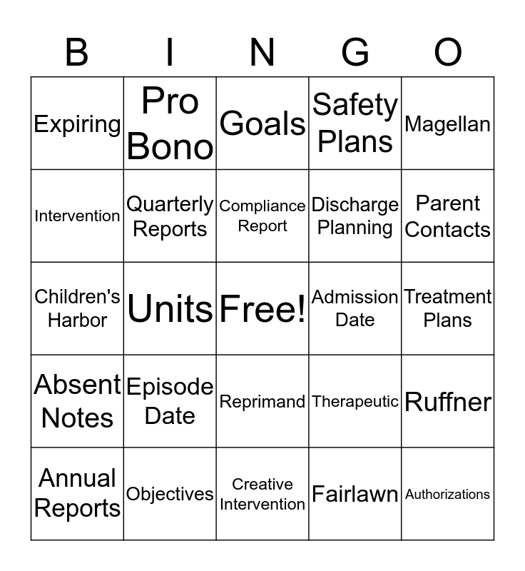 This bingo card has a free space and 39 words: Individual Sessions, Group Sessions, Progress Notes, Quarterly Reports, Annual Reports, Reprimand, Compliance Report, SRA's, Magellan, Absent Notes, Units, Safety Plans, Authorizations, Treatment Plans, Admission Date, Episode Date, Person Centered, Expiring, Yearly Evaluation, Therapeutic, Intervention, Creative Intervention, Discharge Planning, Parent Contacts, Referrals, Incident Reports, Credible, Credible Calendar, Medicaid, Pro Bono, Service Coordination, Frequencies, Goals, Objectives, Fairlawn, Taylor, Ruffner, Children's Harbor and Academy for Discovery.