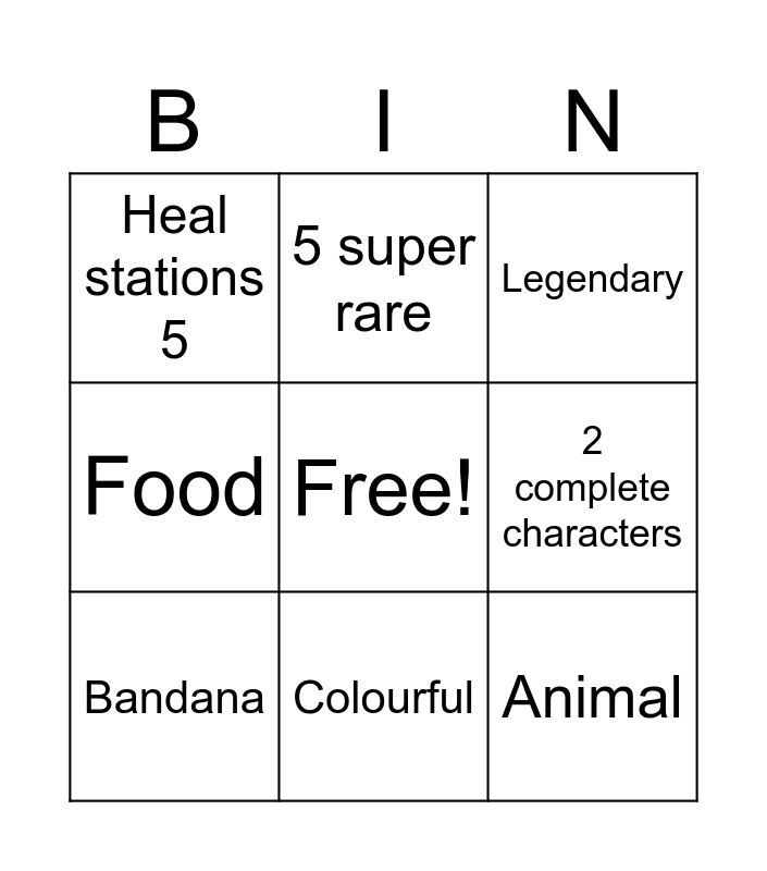 This bingo card has a free space and 8 words: 2 complete characters, Legendary, 5 super rare, Bandana, Heal stations 5, Animal, Food and Colourful.